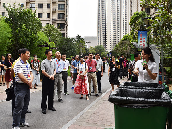 考察团听取有关人员关于垃圾分类工作的情况介绍