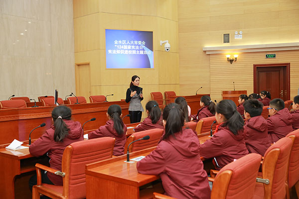 活动当天,来自金水区纬五路第二小学的22名小学生,首先参观了区机关一楼西厅区人大常委会会议室,听取了金水区人大及其常委会的成立和发展史,了解了人民代表大会制度的概念、产生、职权、地位、作用.....,《宪法》的发展历程和《宪法》修订的主要内容等法律知识。