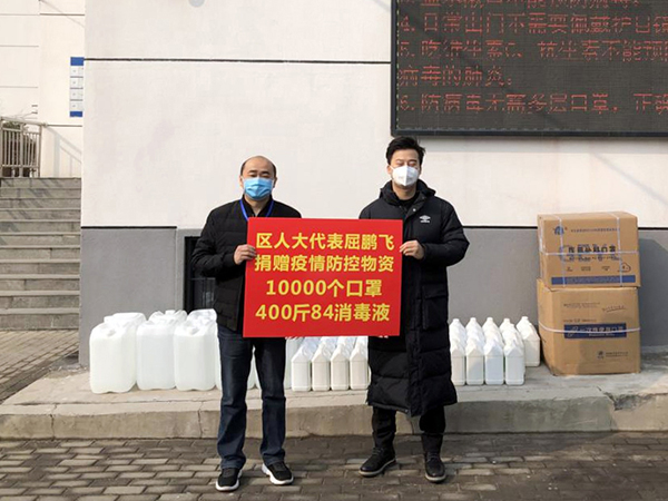 管城区人大代表、郑州市管城回族区乾元小额贷款有限公司风控部职员屈鹏飞先后累计向街道一线工作人员捐赠10000只医用外科口罩,500斤84消毒液和500斤酒精。