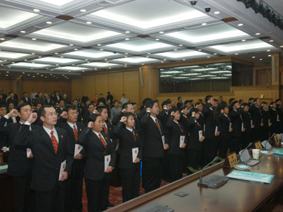 会议还以无记名投票的方式,表决通过了人事任免案,任命了市法院28名及市检察院1名工作人员的法律职务,新任命人员手捧宪法、面向国徽宣誓就职。
