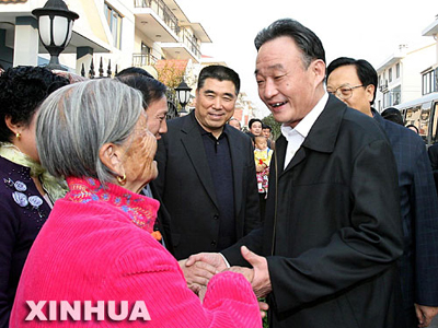 吴邦国委员长在河南新乡七里营镇刘庄村,看望毛玉亭老人(前左)一家(图片来自新华网)