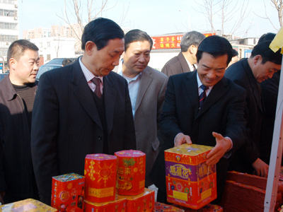 代表们在市人大常委会领导郝建生、白红战、栗培青、王旭彤等带领下,分别听取了市公安局、安监局、供销社有关烟花爆竹限放工作情况的汇报,并到市内各区的销售点实地察看。视察中发现,各销售网点经营的烟花爆竹品种多样,店内都配备了消防器材,挂有安全警示标志,都有“经营许可证”和“安全责任书”。