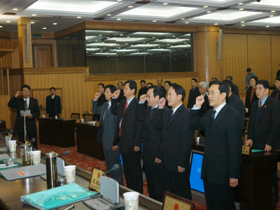 表决结束后,新任命的5位市政府组成人员和市法院3名工作人员手捧宪法、面向国徽庄严宣誓,向全市人民作出了郑重承诺:严格依法行政,公正执法,恪尽职守,执政为民,做人民满意的公务员。