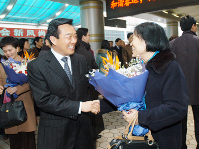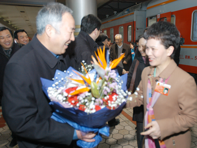 郑州人大网3月17日讯:今天清晨,参加十届全国人大五次会议的驻郑全国人大代表乘车返回郑州。市领导白红战、王旭彤等前往车站迎接。