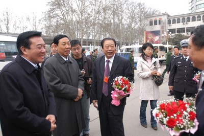 郑州人大网3月19日讯:今天清晨,我市参加十一届全国人大一次会议的代表乘火车返回郑州。市人大常委会主任郝建生、党组书记白红战、副主任王旭彤前往河南宾馆迎接代表归来。