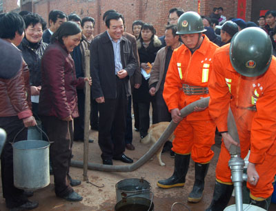 郑州人大网2月12日讯:“太感谢了,乡亲们这两天不用再走十几里路拉水吃了。”今天上午,登封市颍阳镇鸽子爻村里一片欢腾,两辆专用送水车正在向村民们准备的储水罐里加水。市人大常委会党组书记白红战,副主任王平、栗培青、魏深义、王旭彤、张发亮带领常委会机关干部职工,为村里送来价值16万元的抗旱物资和甘甜的饮用水。