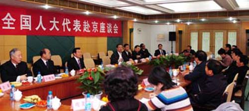 郑州人大网2月28日讯:肩负着全市740多万人民的重托,带着反映百姓心声的议案和建议,出席十一届全国人大二次会议的本市14位全国人大代表,将于3月1日启程赴京。今日上午,市领导王文超、郝建生、白红战、姚待献、胡荃、赵明恩、王旭彤等在嵩山饭店和代表们座谈,欢送他们赴京。
