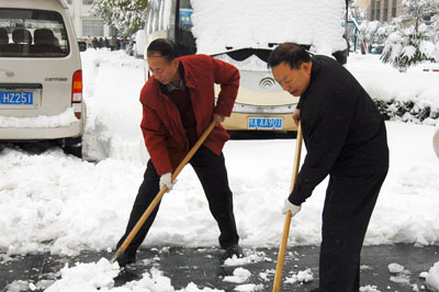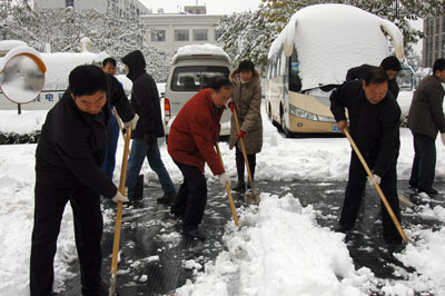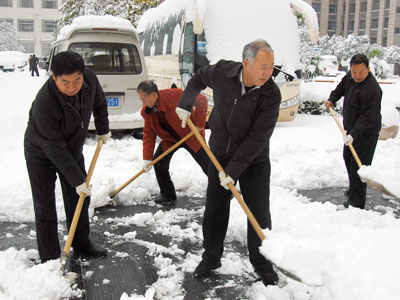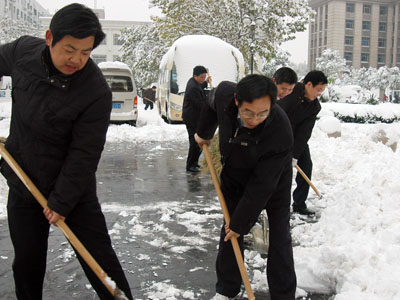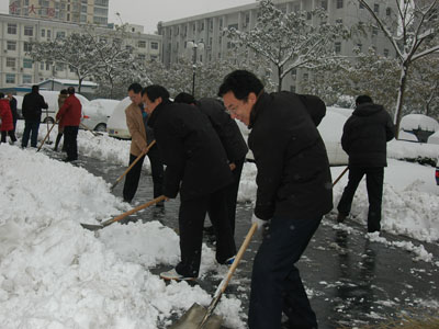 郑州人大网11月12日讯:今天早上,市人大常委会机关人员在副主任王旭彤、秘书长刘焕成的带领下,冒着严寒,积极清扫路面积雪。大家除冰扫雪,清理路面,干得热火朝天,很快路面积雪得到清除,方便了行人及车辆通行。