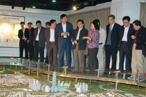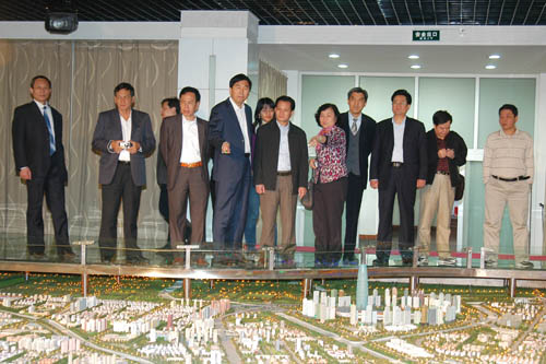代表团一行观看了郑东新区规划沙盘模型,并到郑州国际会展中心、河南艺术中心等地进行实地参观。