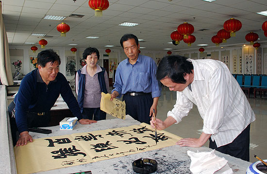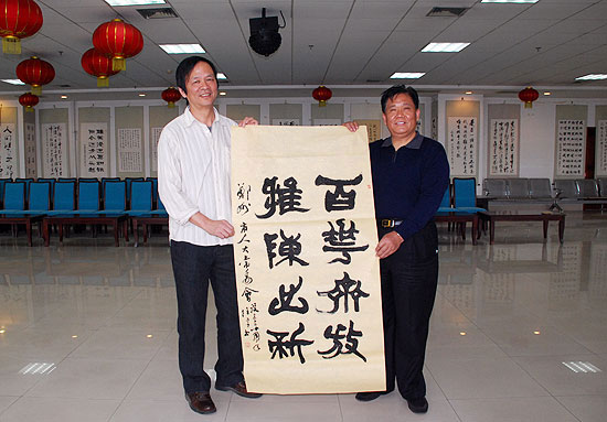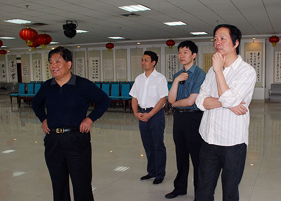 郑州人大网5月24日讯 今天上午,文化部中国艺术研究院博士生导师、国内著名书法教育家任平先生,北京大学艺术学院副院长余虹教授一行来到郑州市人大系统书画院,在书画院院长李保山、副院长赵英,市人大常委会副秘书长张辉的陪同下,参观了由市人大常委会机关干部职工创作的部分书画作品。