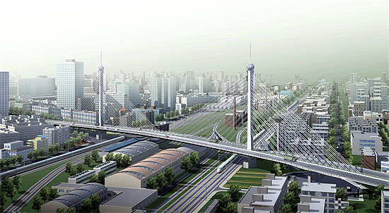 郑州市中心区铁路跨线桥工程于2007年12月25日开工,西起郑大一附院立交,向东沿建设路跨过金水河、京广路、京广陇海铁路后,再沿解放路跨越二马路、铭功路、福寿街,在民主路落地,全长1710米,主要包括跨铁路主桥、东引桥、西引桥等。其中跨铁路主桥为双塔单索面三跨预应力混凝土斜拉桥,全长460米,宽度为33~42.07米,最大跨度248米,双向六车道,双塔高度为64.5米。西引桥长724.2米,宽度为16.25~43.4米,29跨,跨径为20~32米不等;东引桥长526米(其中桥梁377米),14跨,跨径为23~26米不等。匝道桥共四道,全长1182米,桥宽8~9米;建设路跨金水河桥一座,桥长37米,宽50米。