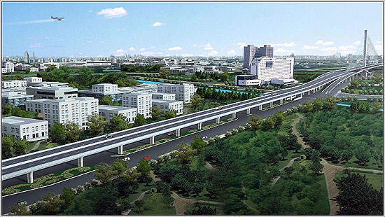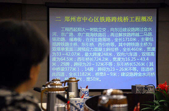 调研组一行实地察看了郑州市中心区铁路跨线桥建设工地现场,听取了项目负责人的情况介绍,了解工程进展情况、拆迁情况、安全情况和施工遇到的问题,尔后在市人大13楼会议室听取了该项目负责人樊铁钢的汇报。郑州市中心区铁路跨线桥工程,西起河医立交,向东沿建设路跨过金水河、京广路、京广陇海铁路后,再沿解放路跨越二马路、铭功路、福寿路,在民主路落地,全长1710米,主要包括跨铁路主桥、西引桥、东引桥,工程投资约3.34亿元。其中主桥全长460米,宽度33-42.07米,最大跨度248米,双向六车道,双塔高度64.5米;西引桥724.2米,东引桥526米。该桥梁施工方为中铁大桥局,桥梁施工采用了国内较为先进的旋转及单索面三跨混凝土斜拉技术,设计水平及科技含量比较高。工程于2007年12月25日开工,预计于2010年12月31日前竣工并投入使用。