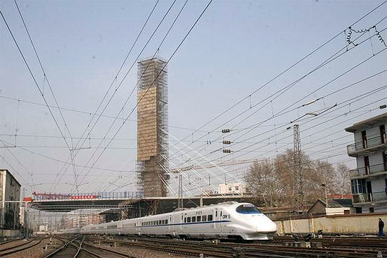 2010年1月27日,郑州市中心区铁路跨线桥成功转体后,一辆高铁列车从桥下驶过。(资料图片)