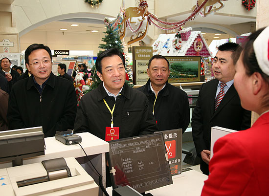白红战一行在郑州中央商务区丹尼斯步行街向收银员了解当天的销售情况