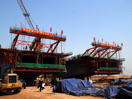 国道107线郑州段改建工程南水北调大桥工程位于K32+471出跨南水北调引水总干渠,干渠过水断面上口宽度76米,根据南水北调总干渠过水断面及河堤通行 净空的要求,采取70米+110米+70米变截面预应力连续梁桥梁跨越,跨中粱高2.8米,中墩墩顶粱高5.5米,该桥桥位 处路水交角90°,主桥采取单箱双室预应力混凝土连续结构,大桥全长共259.32米,并且是全国吊篮工艺单孔跨度最大的公路桥。目前工程紧张顺利,预计6月1号完工。
