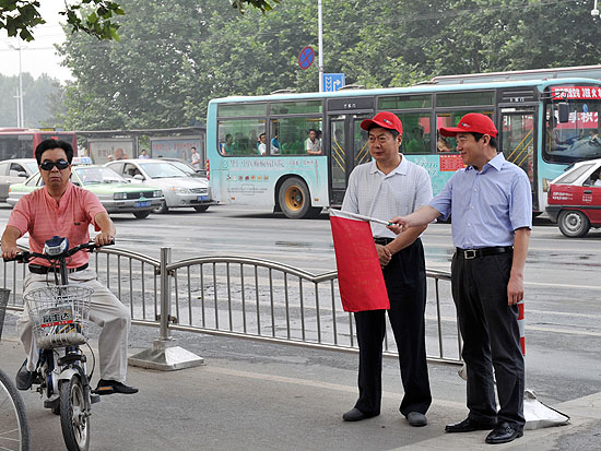 郑州人大网7月21日讯 今天上午,800多名各级人大代表走上街头,以一名普通交通协管员的身份来劝阻和制止市民不文明交通行为,号召市民应遵守交通法规,做一名文明交通参与者,为我市创建全国文明城市做出应有的贡献。市人大代表白红战、栗培青、雷志、刘全心、李元法、周长松、刘焕成走上街头和众多人大代表一起参加劝阻不文明交通行为的活动。