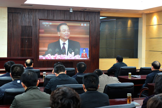 在听了温家宝总理所作的政府工作报告后,大家一致认为,报告客观的总结了去年的工作,明确了今年政府工作的基本思路和主要任务,突出了科学发展、宏观调控的主题;突出了转变经济发展方式的主线;突出了关注民生、执政为民;突出了政府职能、财税金融等的改革发展。是一个求真务实,令人鼓舞,催人奋进的报告,为今后的工作理清了思路、指明了方向。