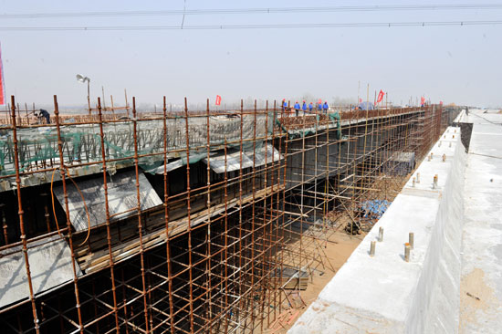 南水北调大桥是国道107新线郑州段跨越南水北调总干渠的主要桥梁,该桥长度为260米,由上、下行两幅组成,单幅桥面的宽度为21米。桥轴线与南水北调总干渠呈90度正交。目前,该项目东幅已完成主体工程,正在进行搭板施工;西幅正在拆除临时支墩及支座,进行体系转换,计划今年5月全部完工。