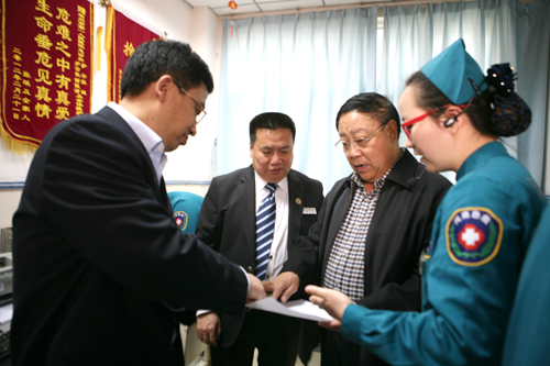 随后,赵主任一行实地调研察看了120指挥调度大厅、院前急救人员培训室、特勤大队应急物资储备库及郑州市第一人民医院急救站。