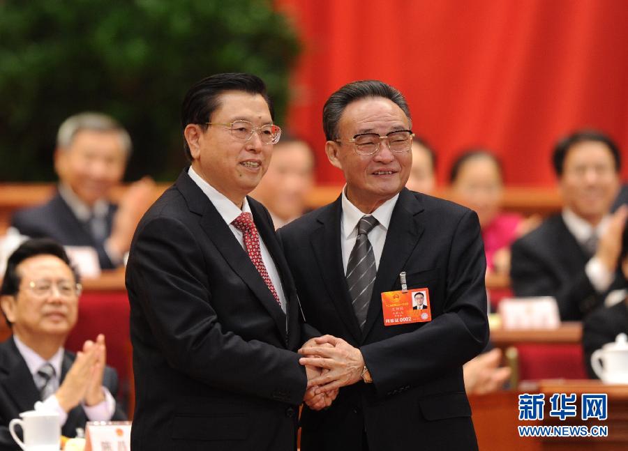 3月14日,十二届全国人大一次会议在北京人民大会堂举行第四次全体会议,选举第十二届全国人民代表大会常务委员会委员长、副委员长、秘书长;选举第十二届全国人民代表大会常务委员会委员;选举中华人民共和国主席、副主席;选举中华人民共和国中央军事委员会主席。张德江当选第十二届全国人民代表大会常务委员会委员长。这是吴邦国与张德江握手。 新华社记者谢环驰摄