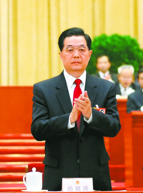 在人大一次会议闭幕会上,全场代表以热烈的掌声向胡锦涛同志表示感谢和敬意。胡锦涛起身致意