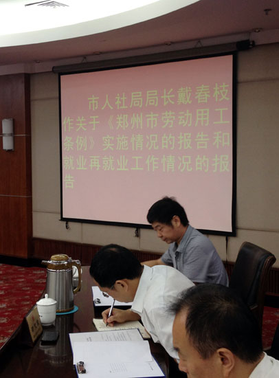 会议听取了我市贯彻实施《郑州市劳动用工条例》情况的报告及就业工作情况汇报以及关于《郑州市劳动用工条例》实施情况的执法检查报告及就业再就业工作情况的视察报告。《郑州市劳动用工条例》自今年1月1日实施以来,市政府采取一系列措施,促进了全市劳动关系健康和谐发展。截至目前,全市各类企业共有职工142万人,已签订劳动合同137.5万人,签订率97.7%;全市规模以上企业劳动合同签订率达100%。截至目前,我市已实现新增城镇就业12.84万人,占全年新增13万就业计划的98.75%;城镇登记失业率控制在3%以内;全市共发放小额担保贷款11.82亿元,实现农村劳动力转移就业7.8万人。