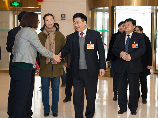 郑州人大网2月22日讯 “大家辛苦了!”今天下午,市人大常委会副主任、大会秘书长雷志亲切看望慰问了参加市十四届人大一次会议新闻报道工作的全体记者。市人大常委会秘书长范强陪同。