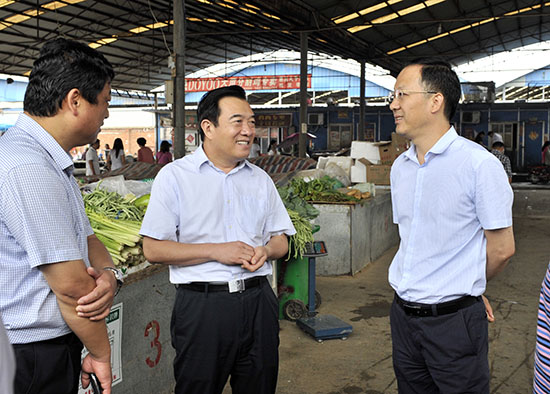 郑州人大网8月7日讯 为了进一步督导推动集贸市场整治工作,今天上午,市人大常委会主任、市集贸市场整治督导组组长白红战带领督导组冒雨暗访了部分集贸市场。