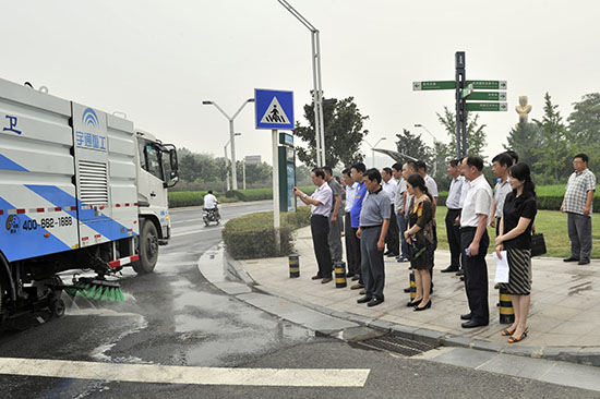 视察组察看环卫机械化清扫作业