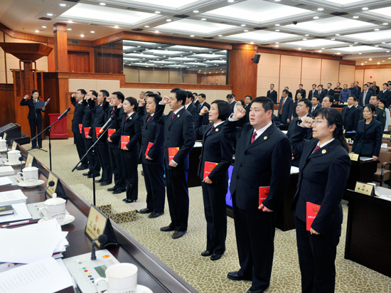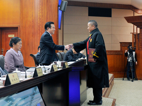 会议还表决通过了有关人事任免案。会议为新任命人员颁发任命书。新任命人员进行就职宣誓。