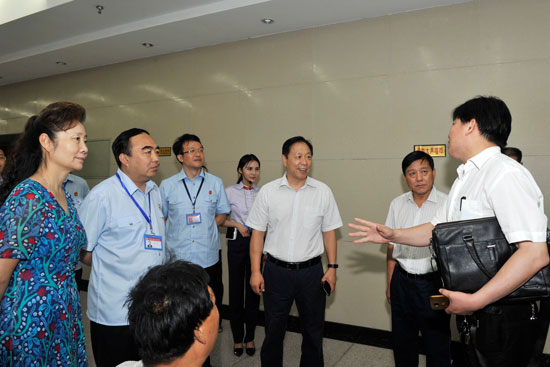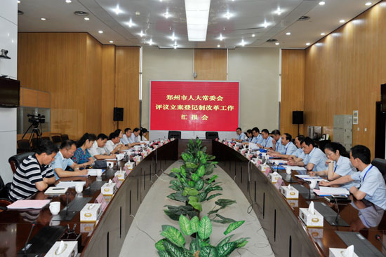 评议调查组一行首先实地察看了郑州中院立案大厅和诉讼服务中心工作运行情况,详细了解各窗口的人员配备、软硬件设施以及立案和诉讼服务制度的相关情况。在随后的座谈会上,评议调查组听取了市中院人民法院院长于东辉作的关于立案登记制改革的工作情况汇报。
