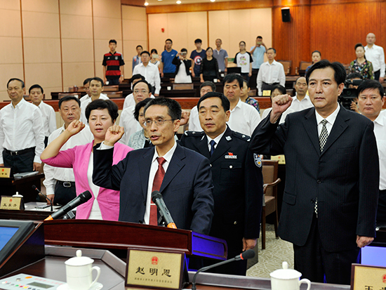 会议为新任命的市政府组成部门工作人员颁发任命书。新任命人员进行宪法宣誓。