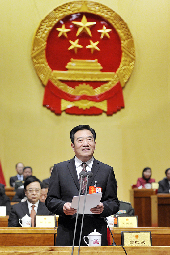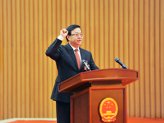 新当选的郑州市监察委员会主任周富强进行宪法宣誓。
