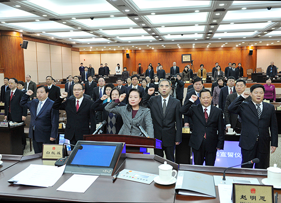在第二次全体会议上,会议审议并表决通过了人事任免案。新任命的市监察委员会副主任岳希荣、葛震远、周英接受任命书;新任命的市监察委员会委员高志、郭秋丽、孙武、宁建海接受任命书。新任命人员进行了宪法宣誓。