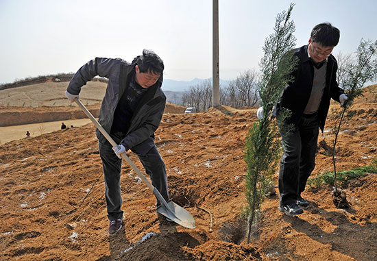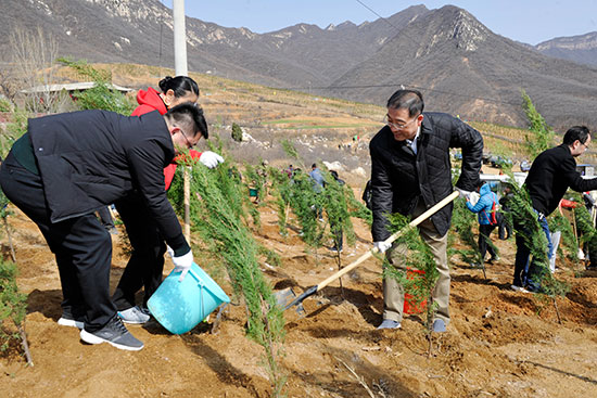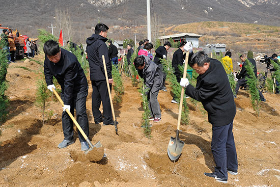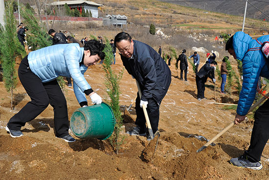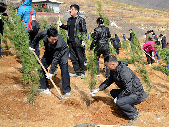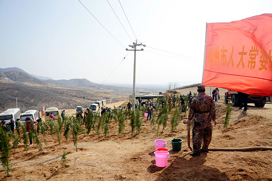 在登封陈家门村义务植树基地,市人大常委会机关干部职工兴致勃勃,干劲十足,大家拿起铁锹,拎起水桶,奔赴自己的“责任田”,刨土、挖坑、扶树、填土、踩实、浇水,不到两个小时,便播下大片新绿。为确保树苗成活率,大家深挖树坑,夯实填土,两次浇水,确保树苗栽植一棵,成活一棵。