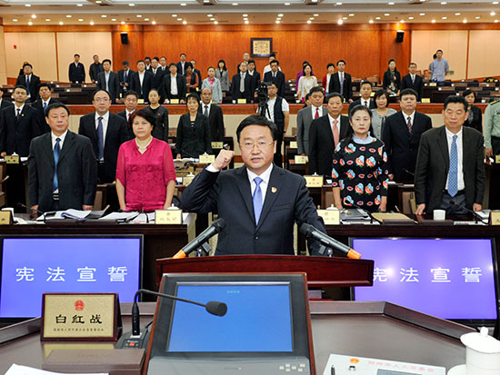 新任命的郑州市人民政府副市长、代理市长王新伟进行宪法宣誓并作任职发言。