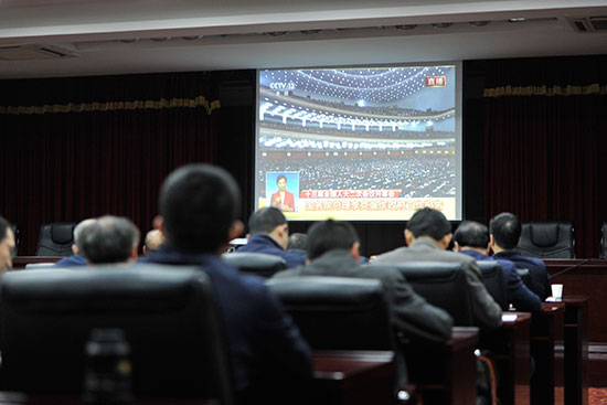 3月5日上午9时,第十三届全国人民代表大会第二次会议在人民大会堂开幕。市人大常委会机关组织全体干部职工集中收看了开幕会实况直播。市人大常委会副主任王广灿、法建强,秘书长周亚民参加集中收看。