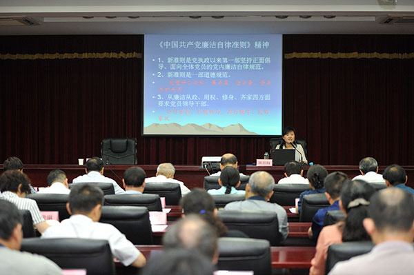 会议首先邀请省纪委第三监督检查室副主任陈红梅同志为大家讲授廉政党课。陈红梅主任围绕“坚持全面从严治党,加强党风廉政建设”的主题,从实际案例出发,给大家上了一堂生动鲜活、见解深刻、发人深省的廉政党课。