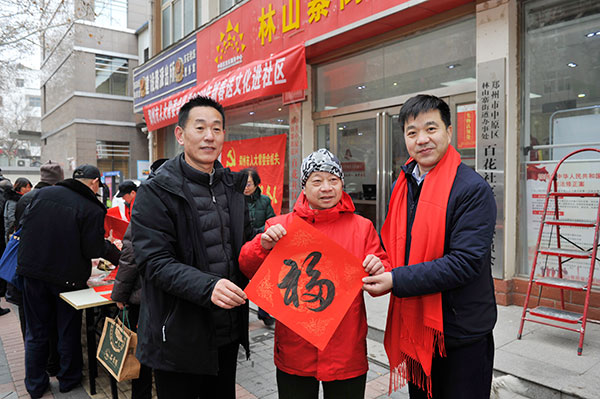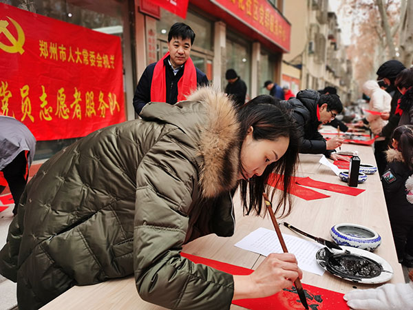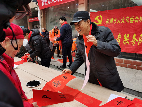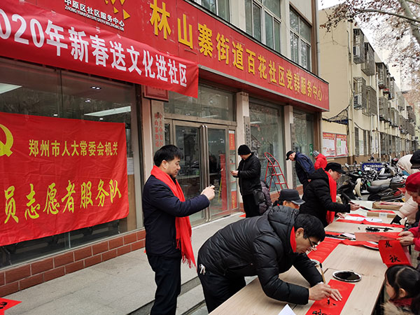 郑州人大网1月15日讯 今天上午,市人大常委会机关党员志愿者服务队到百花路社区,组织了“新春送文化进社区”活动。市人大系统书画院的书法家们进行了现场创作,在寒冷北风中挥毫泼墨,一展风采,为社区群众义务写春联100余幅,送去暖暖的问候,受到人民群众的一致好评。