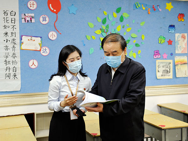 在郑州大学实验小学,调研组详细了解了入班体温检测流程、防疫物资准备情况,仔细查看了学生就餐准备情况,听取学校负责人就复学准备、防疫措施、物资储备等方面的介绍。