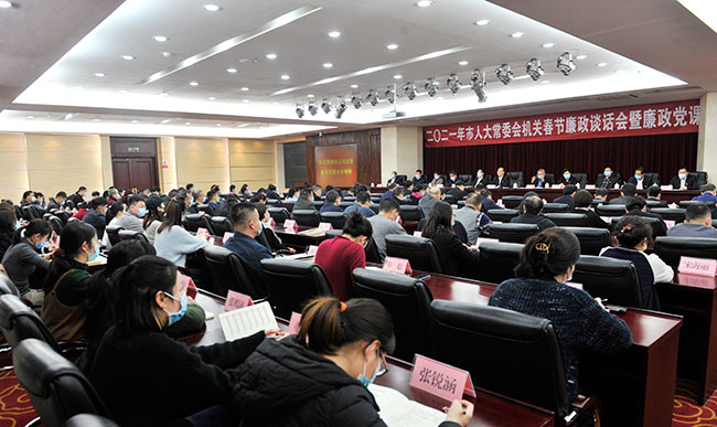 2月9日上午,市人大常委会举行机关廉政谈话会暨廉政党课,贯彻落实十九届中央纪委五次全会、十届省纪委六次全会和十一届市纪委六次全会精神,传达学习市两会精神,安排部署2021年常委会机关党风廉政建设工作。