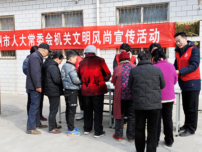 与此同时,来自市人大常委会机关的志愿者身穿红马甲,现场为群众发放市民读本、做文明有礼的郑州人、《郑州市文明行为促进条例》等宣传画册,提升城市文明程度和村民文明素质,引导广大群众过上一个文明和谐、生态环保、健康向上、欢乐祥和的春节。