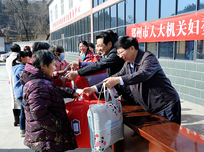 3月4日上午,值此“三八”妇女节来临之际,郑州市人大常委会副主任蔡红、孙黎带领机关妇委会和机关工会一行,莅临巩义市新中镇亚沟村开展慰问活动。巩义市人大常委会主任冯献峰、副主任闫红涛等陪同参加活动。