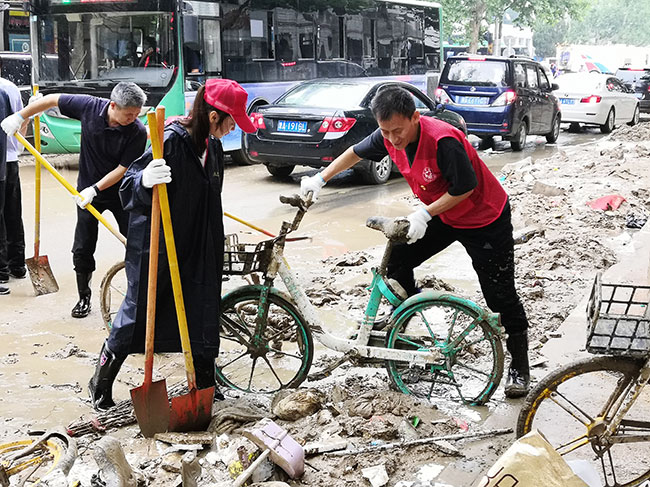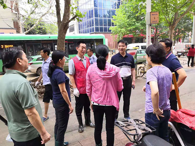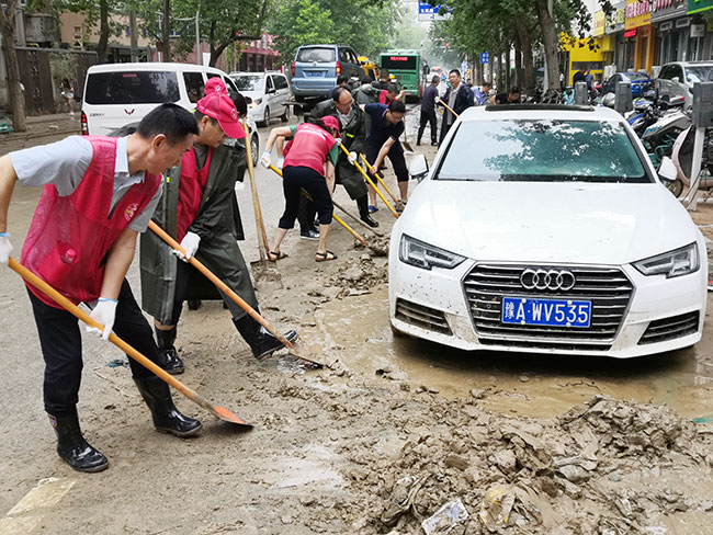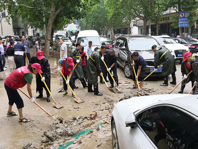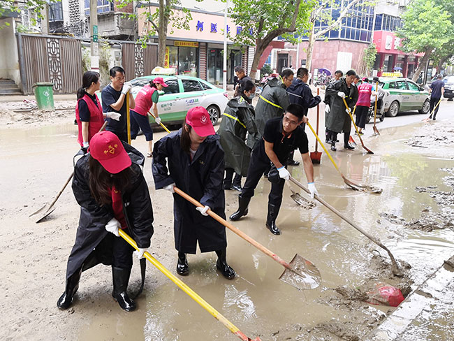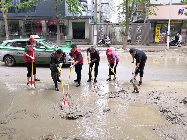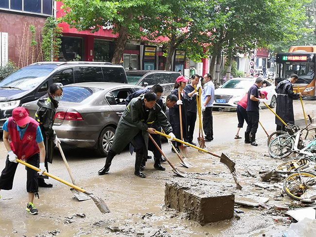 一场百年不遇的特大暴雨让郑州人民群众生命财产安全受到严重威胁。汛情就是命令! 7月22日,市人大常委会机关迅速行动,机关党员干部组成九个抢险突击队,下沉到金水区人民路街道办事处开展清淤、清障、安全隐患排查等防汛救灾工作。 在东明路38号院,机关党员干部利用铁锹、扫帚等清扫工具,对淤泥路段进行清扫。大家分工协作,全力以赴展开清理工作。确保城市道路安全畅通,用自己的实际行动展现人大机关党员干部的风采。