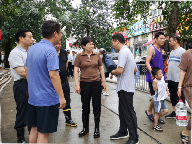 随后,孙黎副主任深入金水区一线督导协调防汛救灾工作,查看防汛抢险、受灾群众救援、灾后重建、生活物资供应等情况,先后前往21世纪社区、河南省新科技市场等受灾严重区域,实地了解救灾情况,孙黎副主任详细询问了抽排水进度和通电、通讯、供水方面的恢复情况,并对紧急救援的一线人员表示慰问和感谢,鼓励大家要在确保安全和质量的前提下,高效有序的开展救援工作,为人民群众的正常生产生活提供保障。