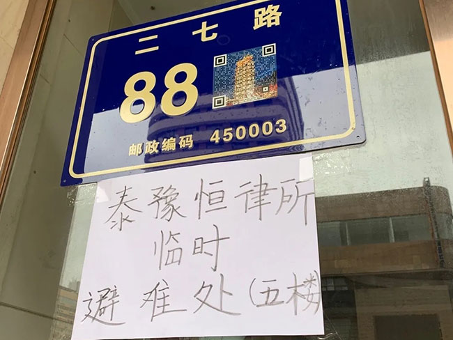 21日早上,曹风犁律师买来了爱心早餐,留宿律所同事用餐后,准备回家。考虑到律所办公条件较大,可腾出第五层办公区域接待受灾群众,在律所主任段学聪的提议下,留在律所的党员成立应急小组,由张博律师任组长,妇联主席魏静、张鹏博、张瑞文、曹风犁、刘哲等同事协助,张贴避难处指引,打扫五楼接待区,备好桶装水、水杯等物资,并向社会发出了安置点通知。通知发出后,有蓝天志愿队等组织和群众与应急小组取得电话联系。应急小组坚守到次日上午合伙人张成律师换班,方才回家调整休息。