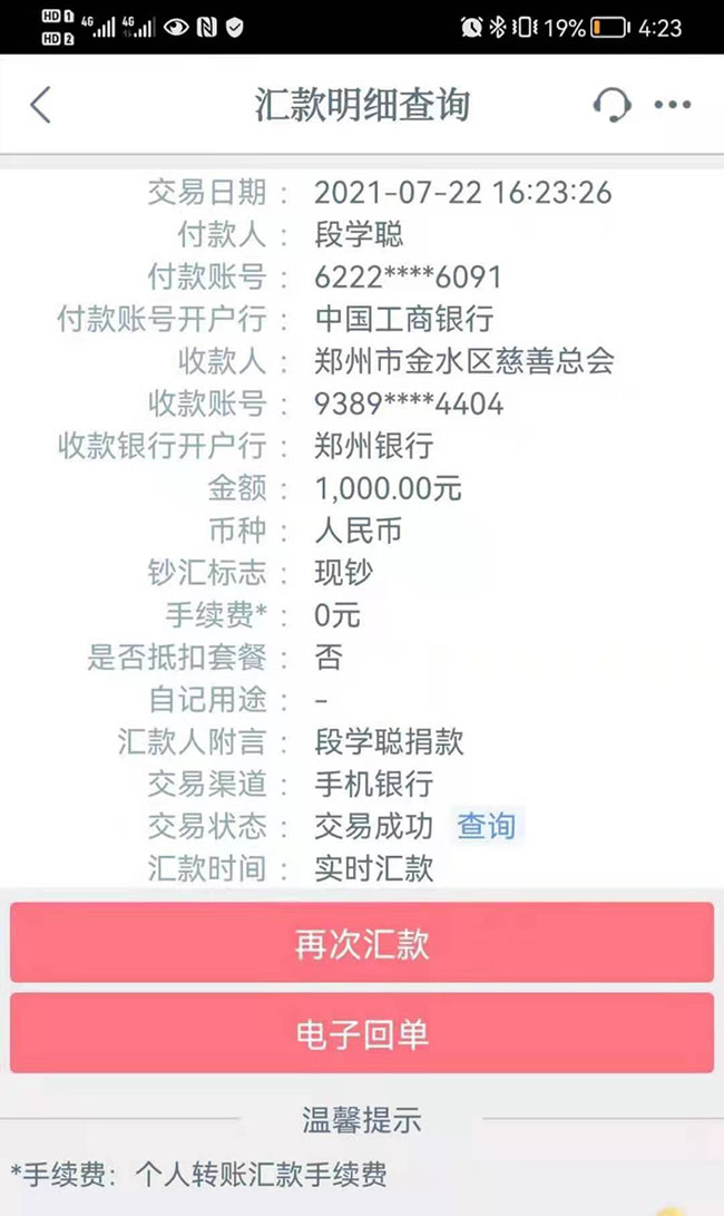 22日下午,在手机信号极弱,电量几近耗尽,自己都还困在灾情的情况下,段学聪在手机恢复信号的第一时间,向郑州市金水区慈善总会捐款1000元,为灾情救援贡献自己的绵薄之力。