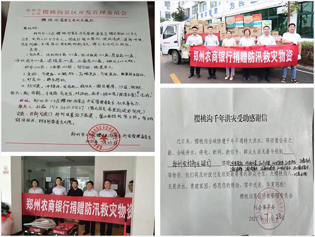郑州市二七区樱桃沟受汛情影响,全域停水、停电、断网、断信号,群众生活严重困难,樱桃沟管委会发出紧急求援。郑州农商银行立即响应,多方筹措物资,仅用1天时间,向当地捐赠2台发电机、1台抽水泵、50箱牛奶、100件矿泉水等价值5万元应急物资,有效地帮助当地群众纾困解难。