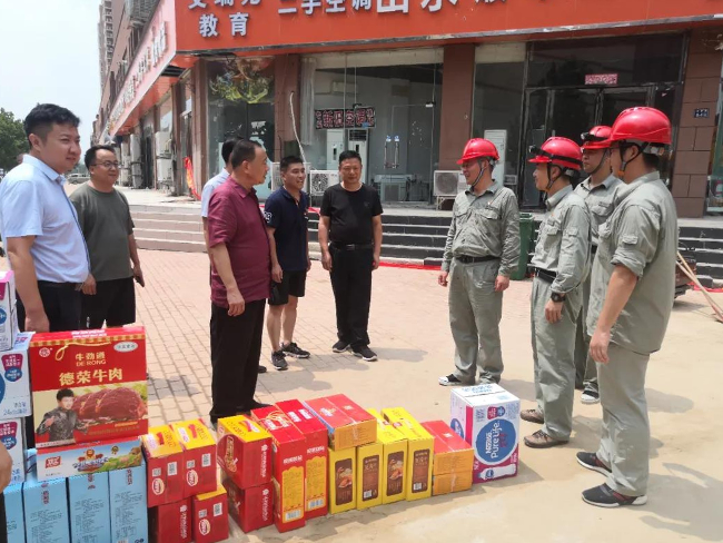 7月25日上午,区人大常委会党组书记、主任王雅伟带领人大机关和长兴路街道同志,到裕华美欣社区看望慰问依然奋战一线的国家电网湖北省支援郑州防汛救灾突击队队员,给他们送上慰问品和全区人民的诚挚谢意。王雅伟关切询问大家这几天的工作和生活情况,得知救援队已连续昼夜作战多天,他叮嘱大家一定注意休息和补充体力,感谢大家为河南拼命,为郑州拼命,惠济人民会永远铭记这份血浓于水的深厚情谊。他要求长兴路街道社区为救援队提供好食宿保障,发动群众开展好生产自救,争取早日恢复正常秩序。