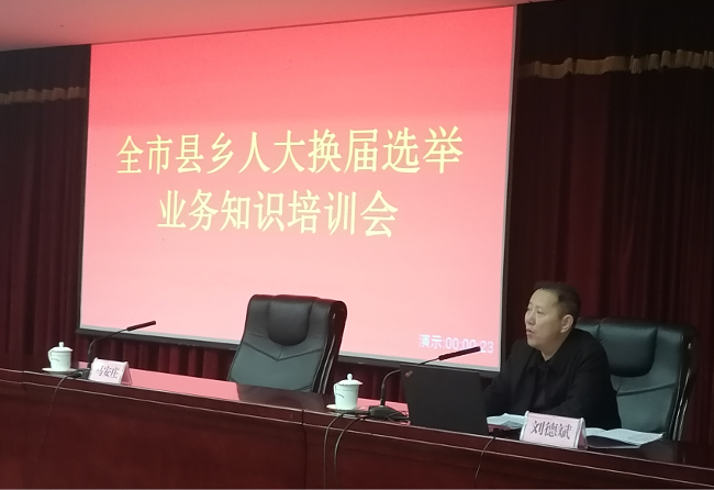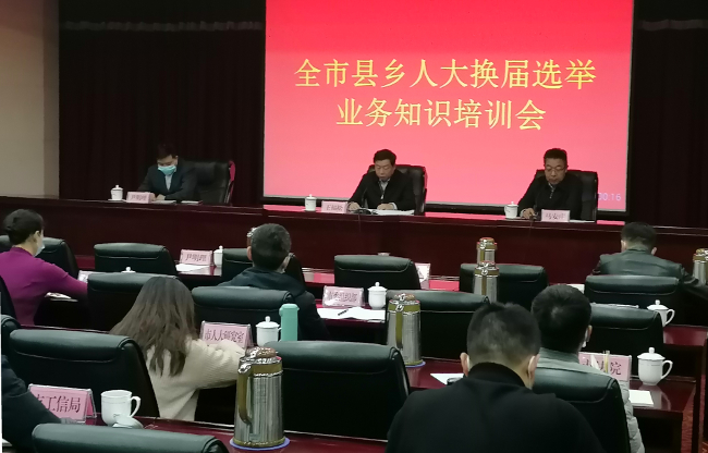 为全面学习贯彻省委、市委县乡换届选举部署议精神,切实做好全市县乡人大换届选举工作,12月22日,市人大常委会组织召开全市县乡人大换届选举业务知识培训会议。会议以电视电话会形式举行,主会场设在市人大常委会机关会议室,各开发区和区县(市)分别设分会场。市人大常委会副主任王福松在主会场参加会议并做动员讲话。
